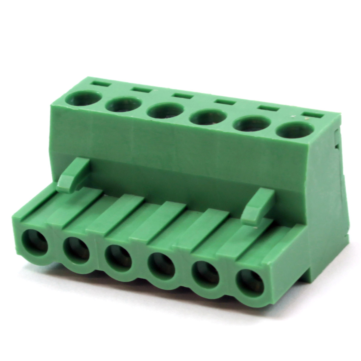 Borne 90º ou 180º, modular (2, 3, 4, 5, 8, 10, 12, 14 ou 18 vias por bloco) para PCI. Com altura de 21,7mm(180º) ou 19,45mm (90º) e passo de 5,08mm. Para fios de 12 a 28AWG. Cor verde (15A/300VCA).