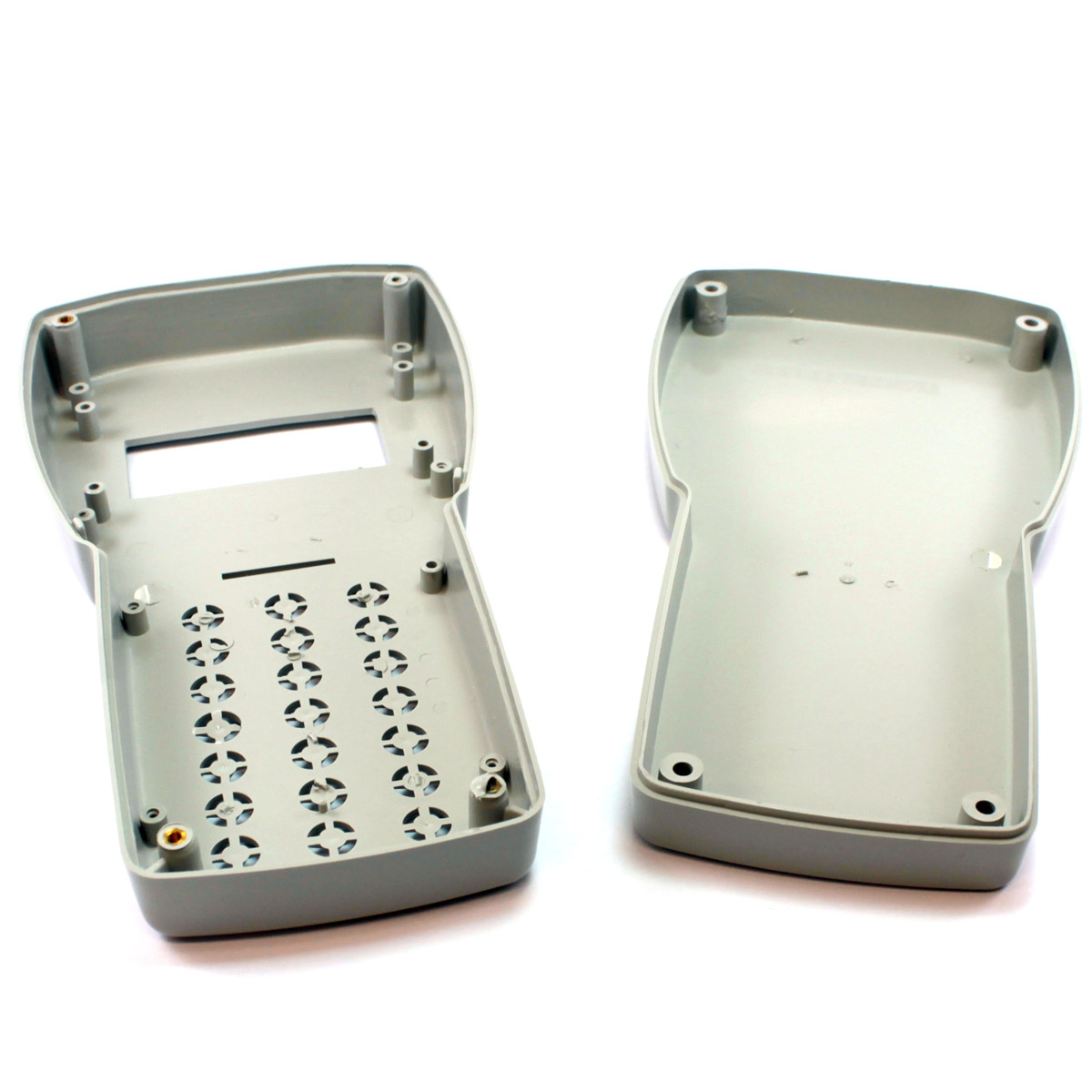 Caixa plástica fabricada em ABS, possui bucha de latão nas torres internas, abertura para display e teclas, apoiadores de borracha para proteção dos parafusos e aderência do produto em superfícies lisas.