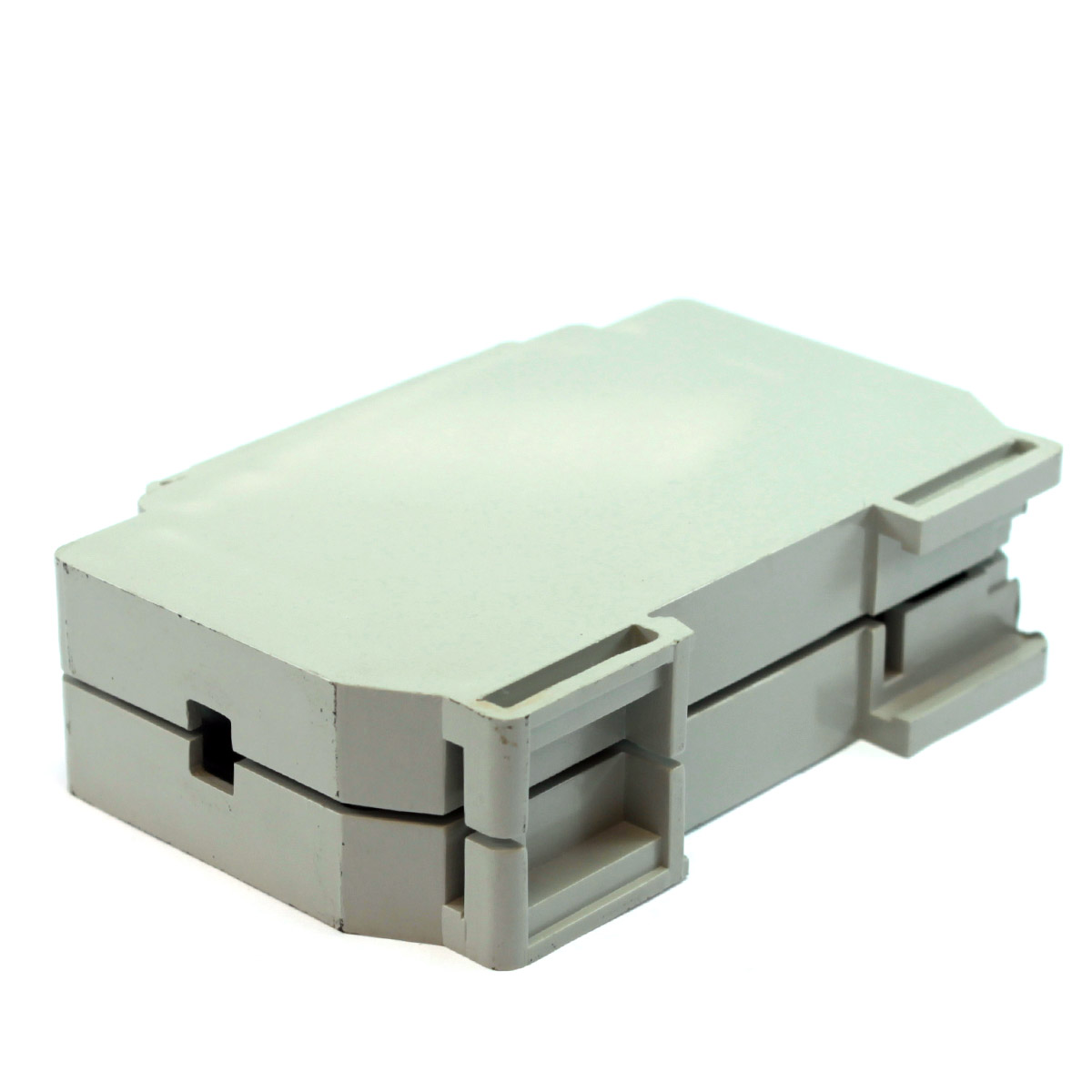 Caixa plástica, com fechamento por pinos internos sob pressão de ajuste, bornes com parafuso imperdível M5, encaixe para fixação em trilho Din 35mm ou com presilha tipo disjuntor.