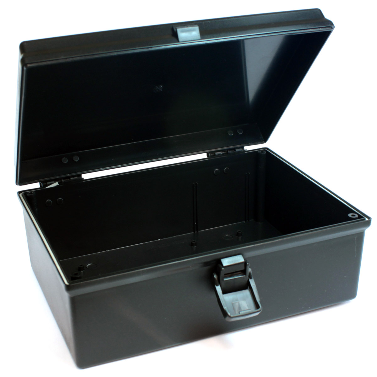 Caixa plástica fabricada em ABS, possui guias e torres para fixação de circuito impresso, trilho para fixação de conector, tampa polida com dobradiça, fechamento com trava de aperto rápido e anel de borracha para vedação.