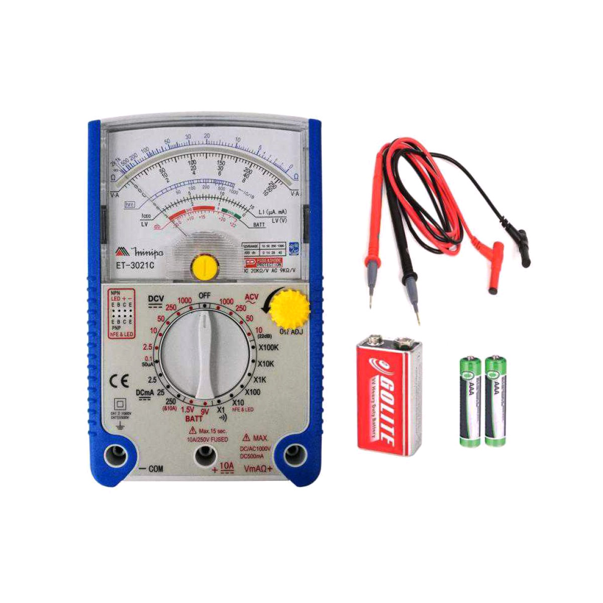 Multímetro analógico ET-3021C (de agora em diante tratado como instrumento), é um instrumento de mão preciso, seguro e robusto, fácil de operar, com bom estojo protetor compacto ao lado e o dispositivo de inclinação traseira. Este instrumento oferece as medidas de tensão DC/AC, corrente DC, resistência e diodo, teste de LED, transistor, decibels e teste de continuidade, ajuste de zero manual para a faixa de resistência e uma faixa exclusiva para medidas de correntes elevadas até 10A DC, além de possuir proteção em todas as faixas. Este multímetro apresentará a máxima precisão quando utilizado na posição horizontal. É um instrumento ideal para uso interno no laboratório, escola, oficina, garagem e casa etc.