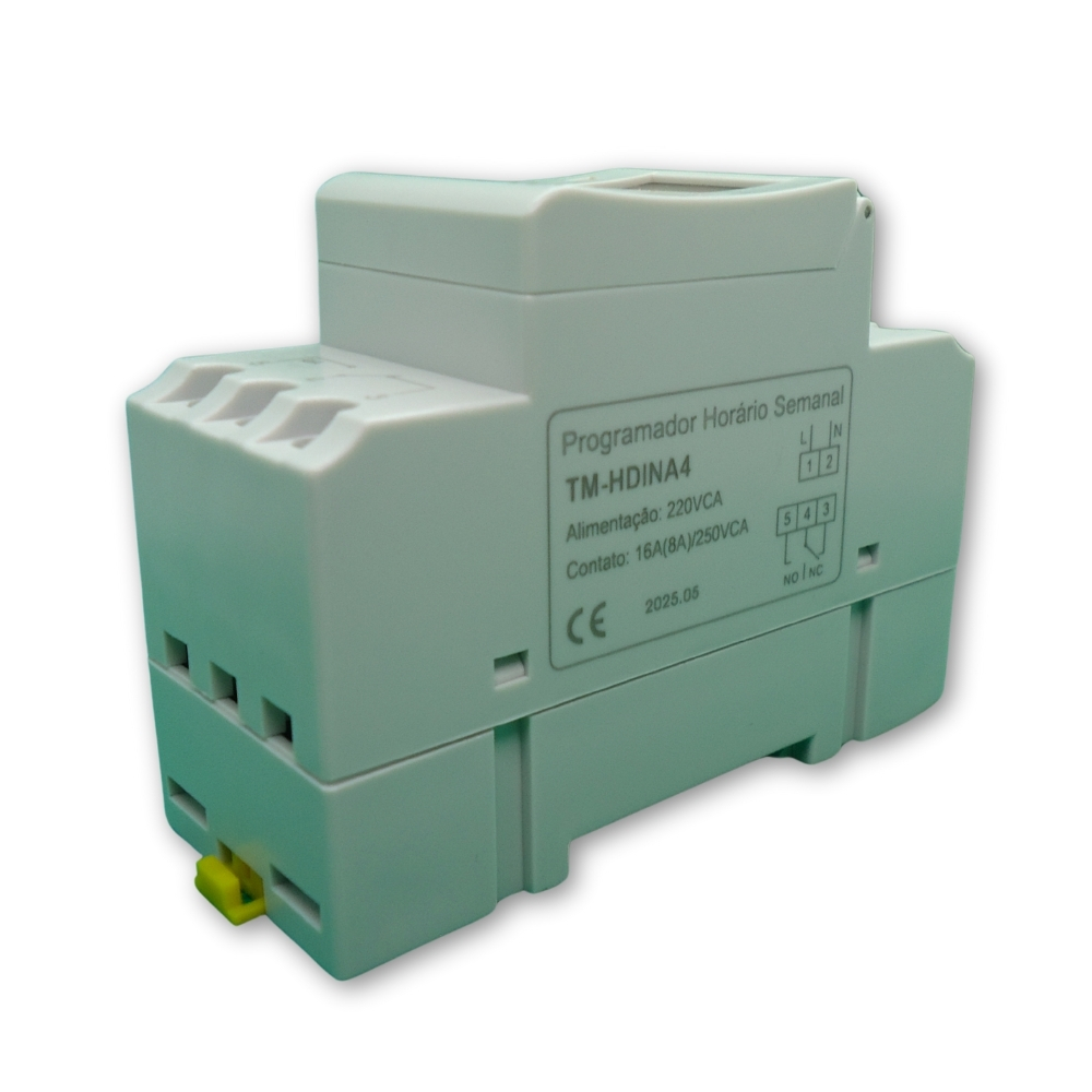 Programador horário semanal com 34 programas e intervalo de ajuste de 1 minuto. Para montagem em trilho DIN. Alimentação 220VCA e saída relé reversível para 16A. Com display de cristal líquido (LCD). Utilizado para acionar equipamentos convencionais automaticamente, apenas escolhendo os horários e dias da semana para ligar e desligar. Ideais para poupar energia elétrica durante períodos em que estes equipamentos, estando ligados, se tornam desnecessários. Por exemplo: Na iluminação de out-door, bombas de piscinas, controle de irrigação, sirenes de aviso de turno, entre muitas outras aplicações.