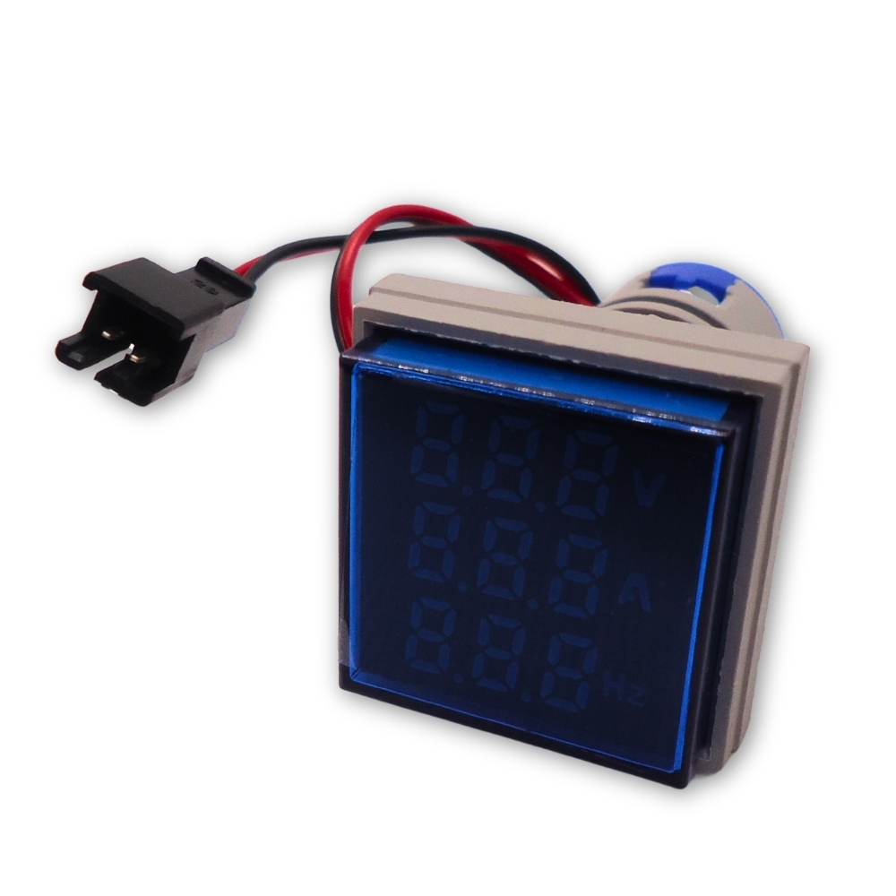 Indicador digital de tensão, corrente e frequência com display LED azul, formato quadrado 28,9x28,9mm para montagem em painel em furação de 22mm. Possui grau de proteção IP65 (display) e alta resistência mecânica. De acordo com IEC947-5-1 e EN60947-5-1. Indica tensão de 50 a 500VAC, corrente de 0 a 100A e frequência de 0 a 99 Hz.